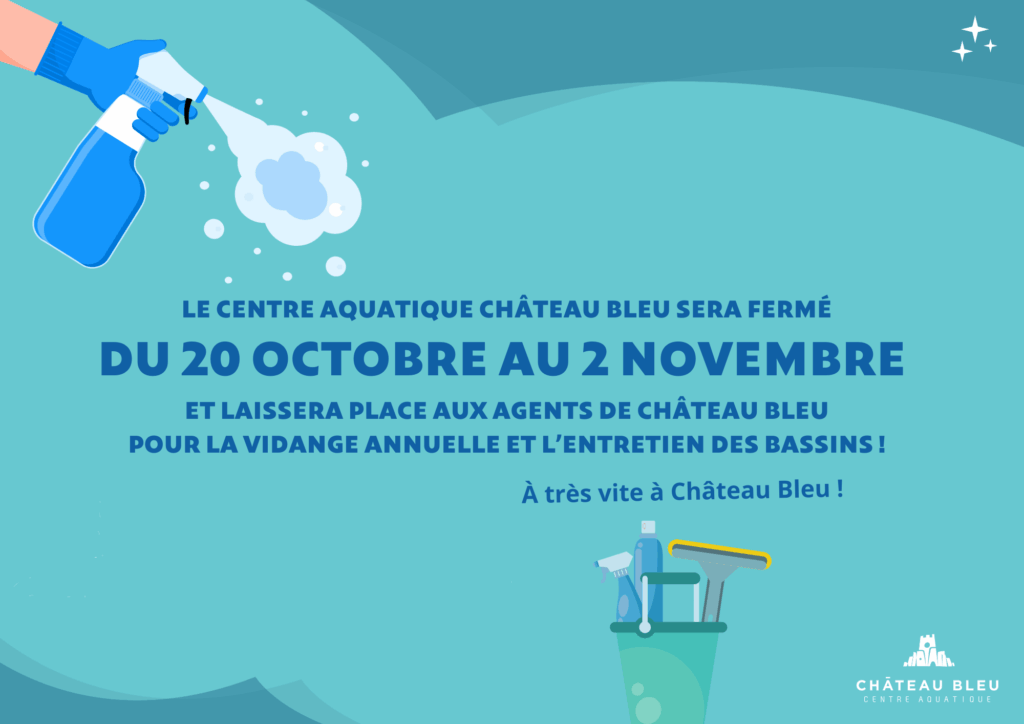 Château Bleu fermera ses portes du lundi 20 octobre au dimanche 2 novembre inclus pour la vidange annuelle obligatoire. Cette opération d’entretien essentielle permet de garantir la qualité de l’eau et la sécurité des usagers tout au long de l’année.